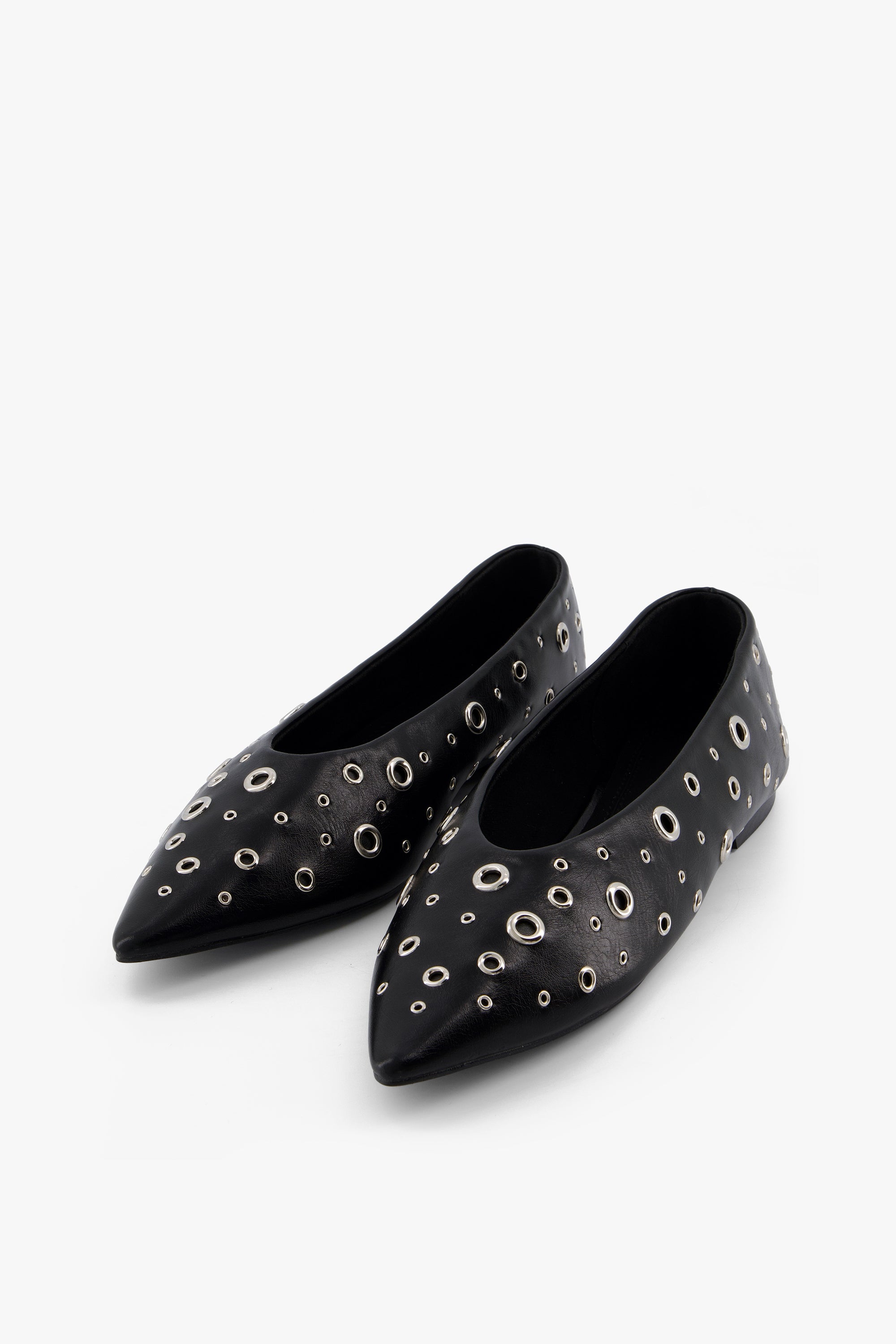 Sleek Pointed Toe Silhouette Punctuated With Mix Size Metal Grommets For A Bold, Modern Edge.