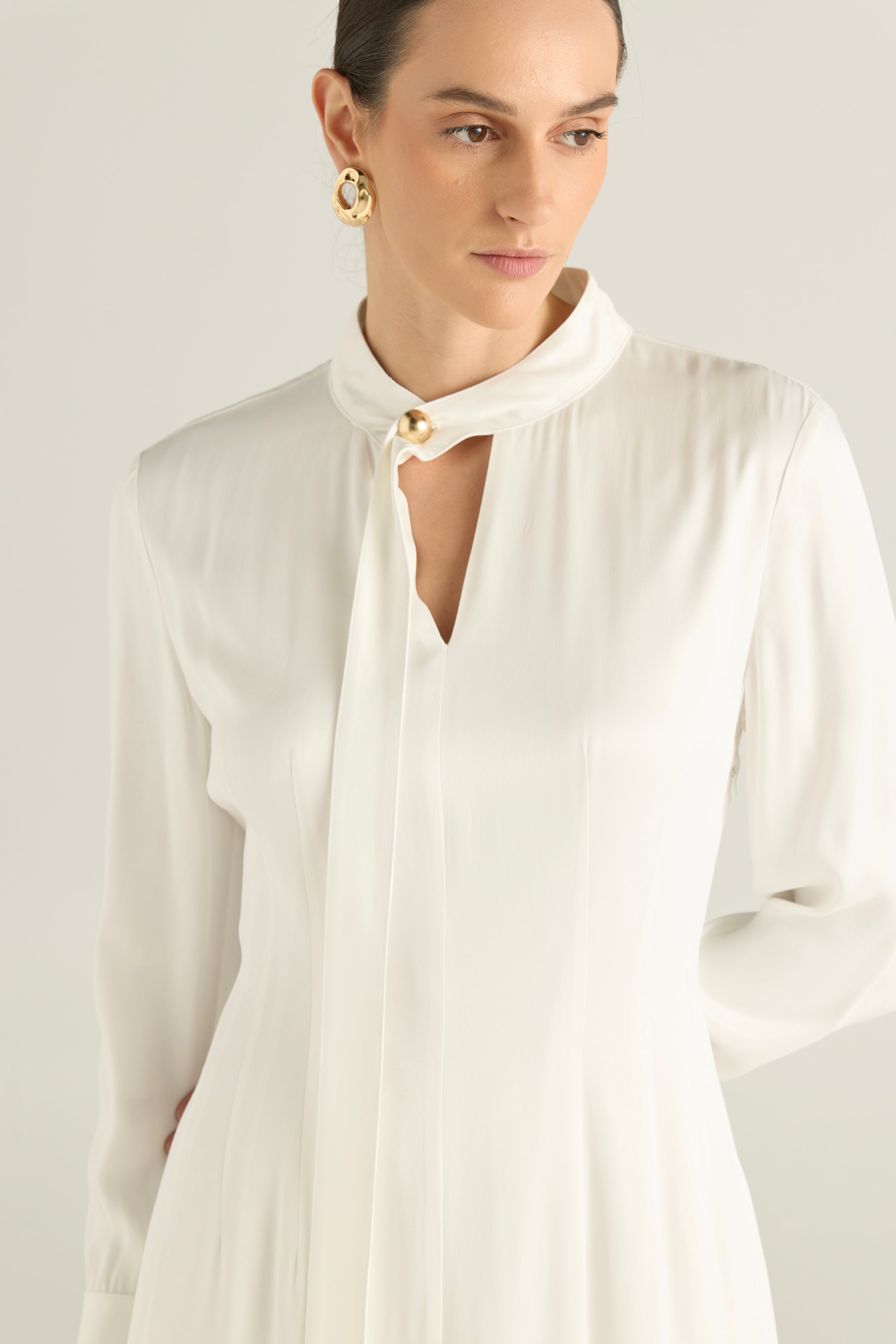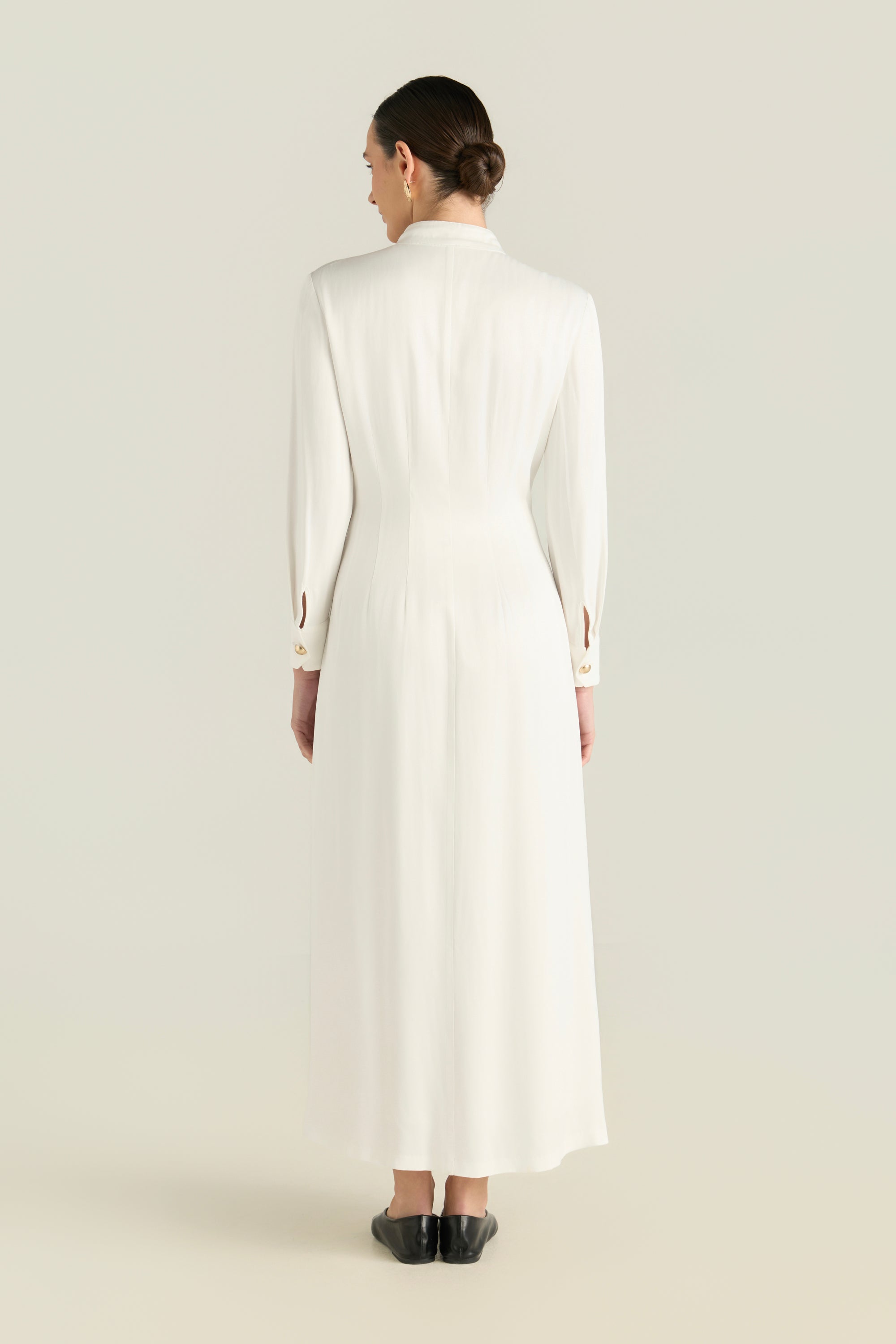 Design : Solid, Satin, Flared Hem, Gold Tone Buttons, Attached Lining