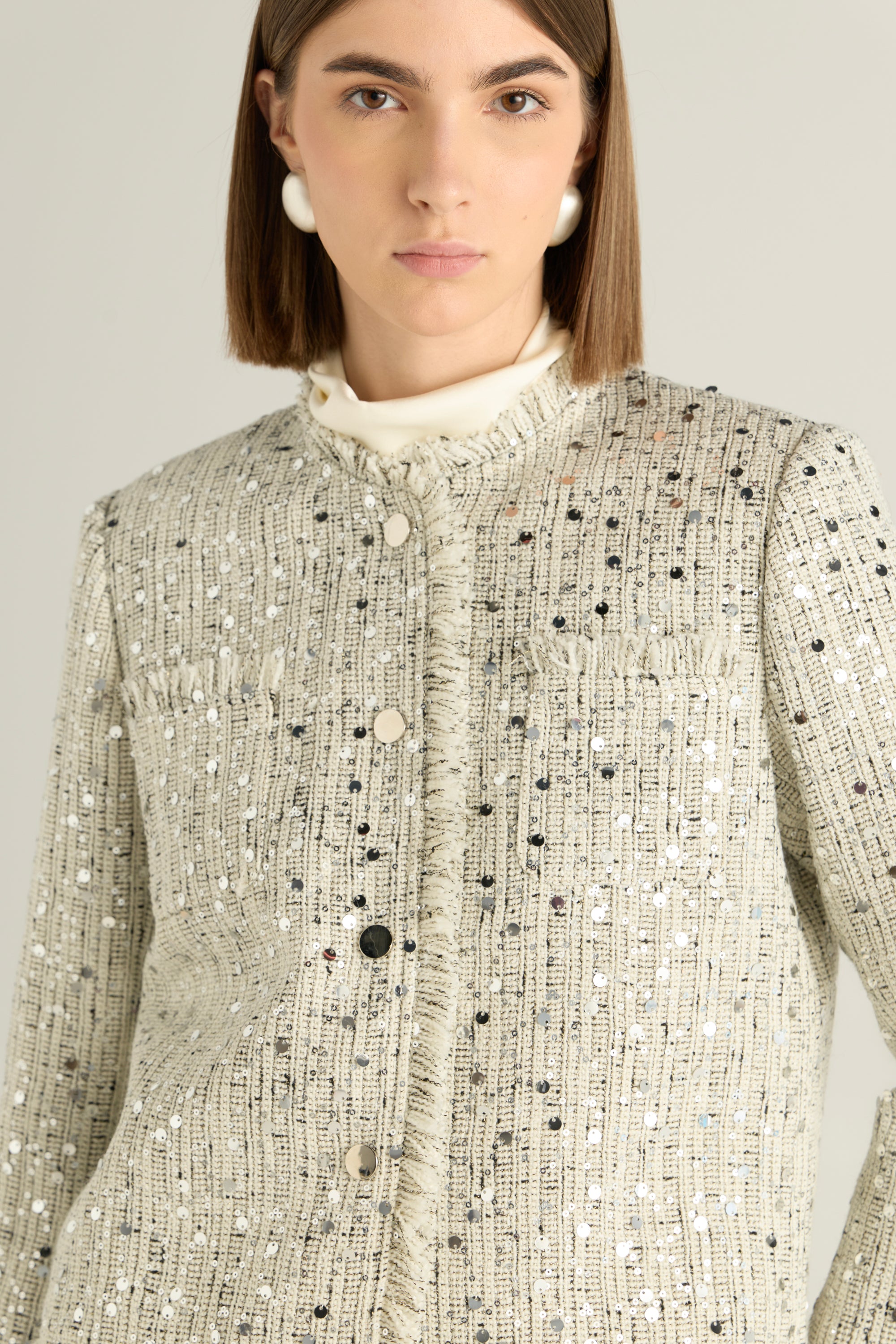 Design : Tweed, Sequin, Embellished, Frayed Hem, Front Pockets, Attached Lining
