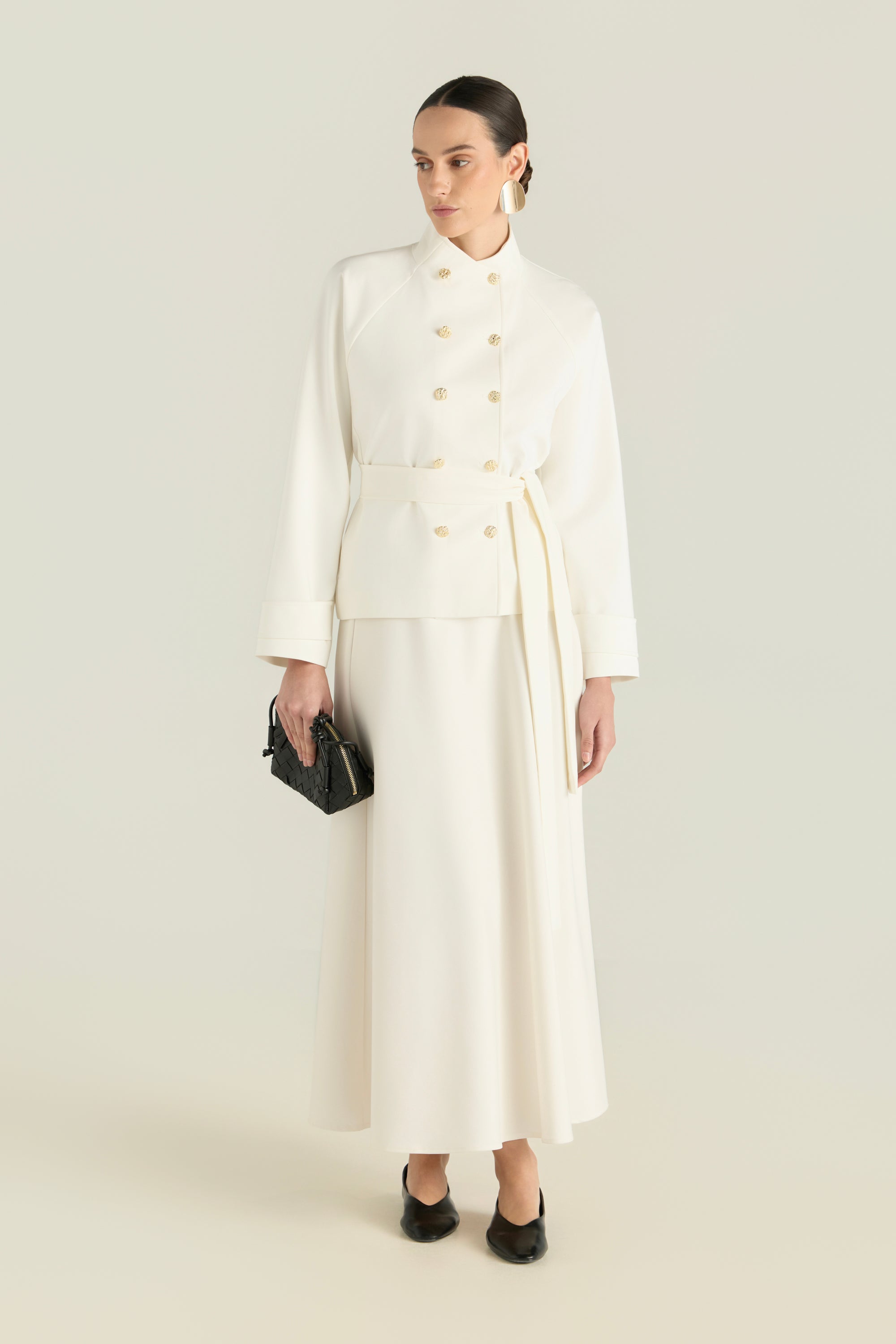 Sleek Raglan Sleeves Meet A Stander A Collar And Gold Buttons Minimal Yet Luxe.