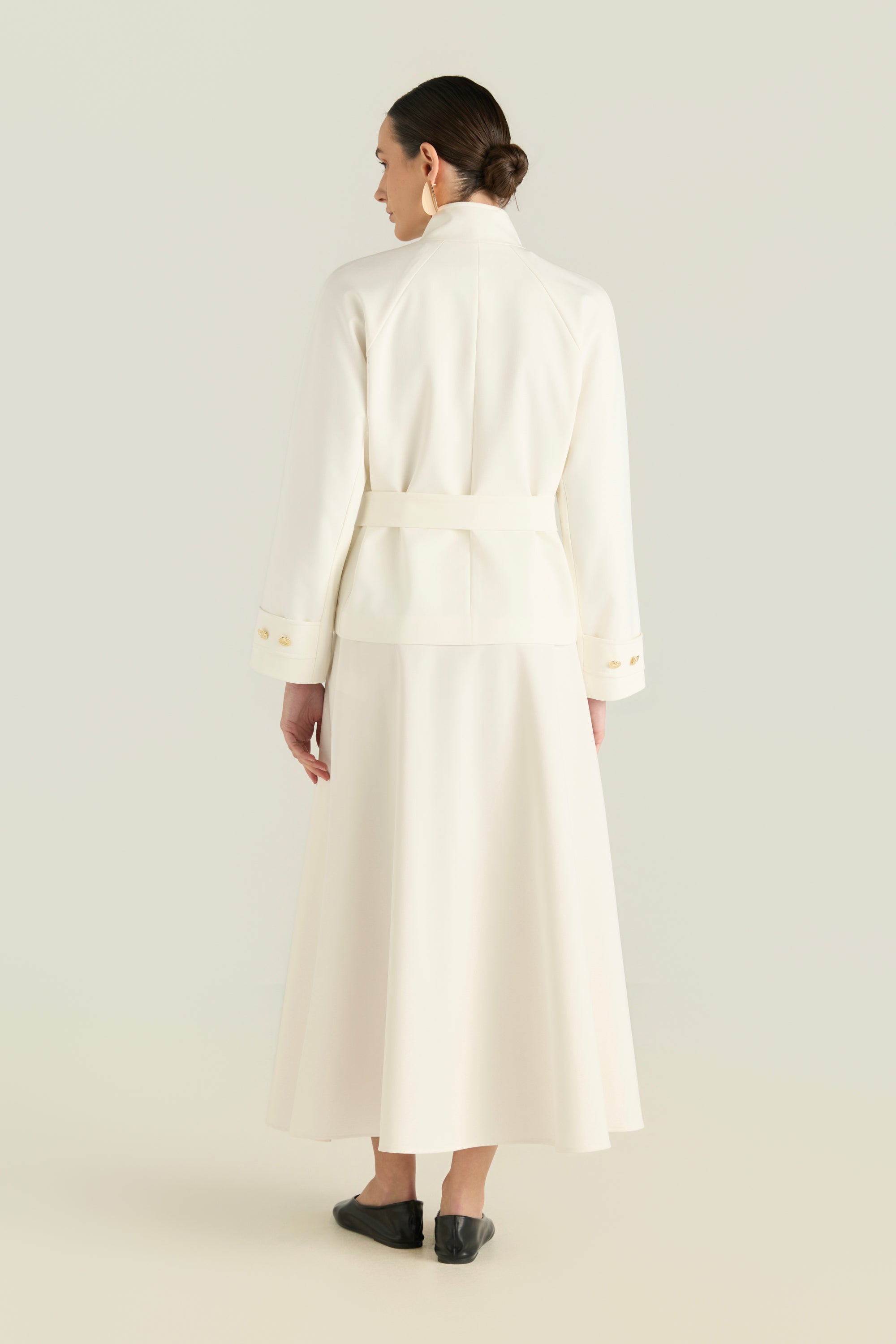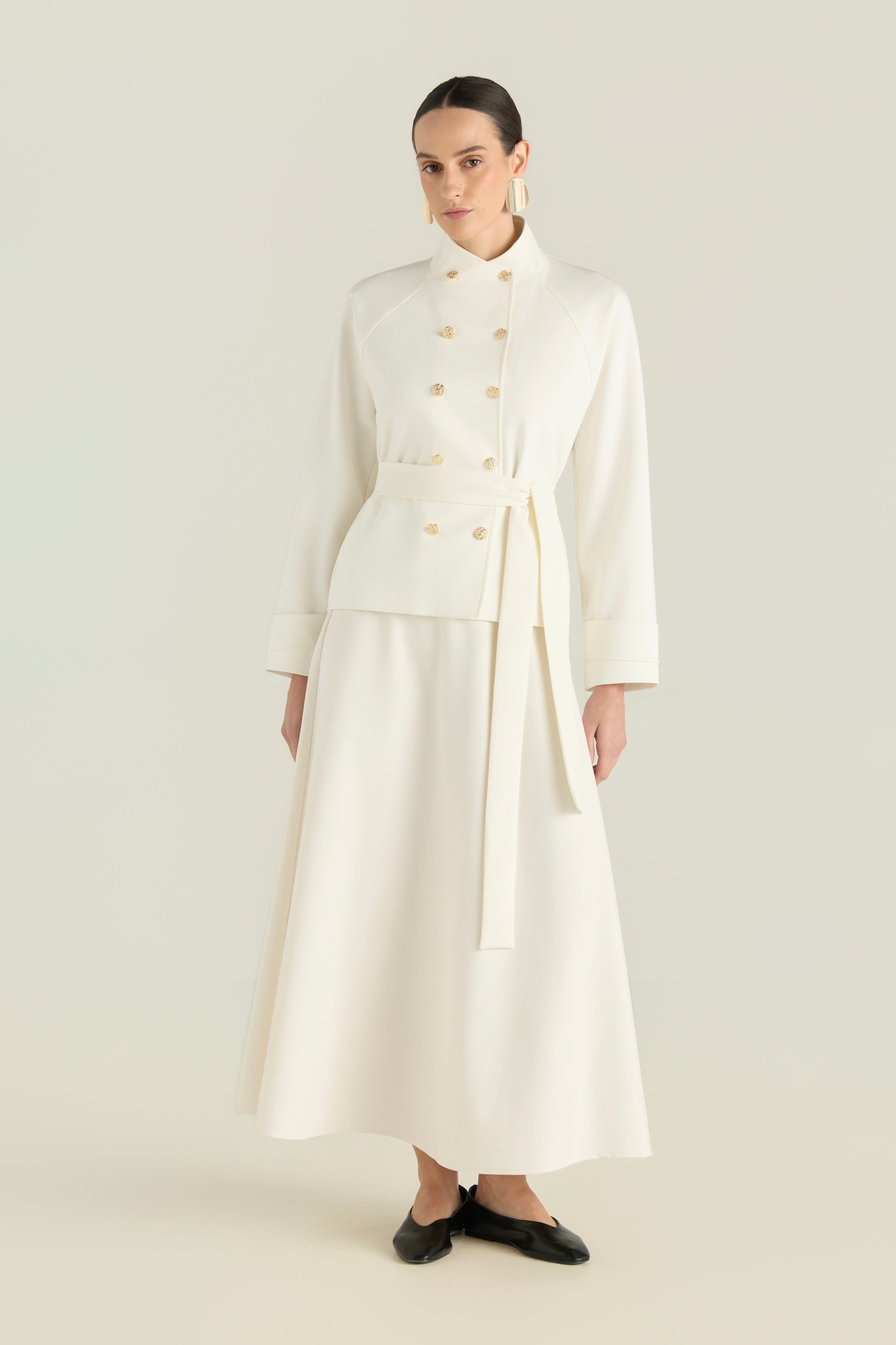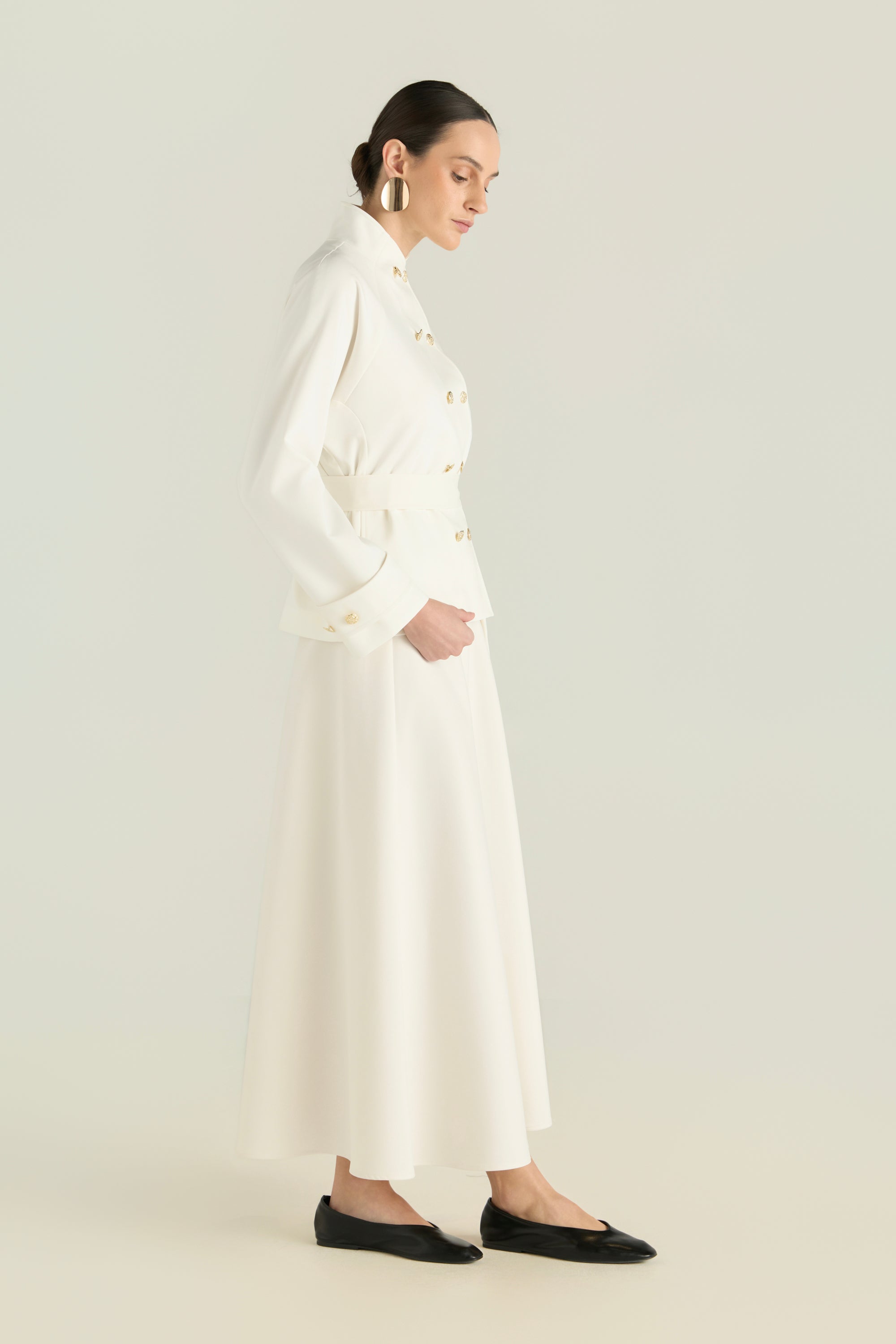 Design : Solid, Gold Buttons, Belt, Side Pockets, Attached Lining